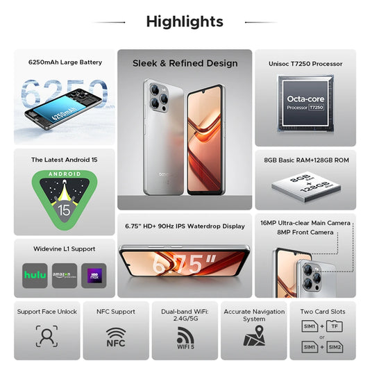 【Brand+】Global Version DOOGEE Note 58 8GB RAM 128GB ROM 6.75" HD+ 90Hz IPS Screen 6250mAh Large battery NFC Android 15